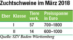 Die Vermarktung von Schlachtschweinen und Ferkeln lief im März stabil bei festen Ferkelpreisen. Für die Eberzüchter in Baden-Württemberg gab es ein kleines Nachfragetief. Gründe: Kaufzurückhaltung bei der Besamung und Lieferverschiebungen im Export. Knapp über 70 Tiere wurden vermarktet, hauptsächlich Klasse I-Eber mit hohen genomischen Zuchtwerten. Es gab kleinere Exporte in andere Bundesländer und nach Belgien. Der Durchschnittspreis erreichte 1135 Euro. Die Spitzeneber der Deutschen Landrasse kamen von Klaus und Philipp Benz in Bingen: Die Meltis- und Marso-Söhne aus französischer Abstammung zeigten sich mit sehr guter Länge und stabilem Fundament. Dazu kam ein Beleg-Sohn von Tobias Peter in Aach Linz. Bei der Rasse Piétrain wurden...