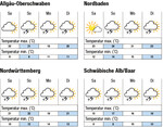 Der Samstag beginnt zunächst freundlich. Gegen Nachmittag ziehen, mit Wind aus Nordosten, Wolken auf, die stellenweise für Schauer und lokale Gewitter sorgen. Die Temperaturen steigen auf 22°C im nördlichen Rheintal, 21°C im mittleren Neckarraum, 19°C am Bodensee und 14°C auf der Alb. Zum Sonntag verdichten sich die Wolken bei Wind aus Osten. Gegen Nachmittag ist weitgehend mit vereinzelten Schauern zu rechnen, das Gewitterrisiko steigt. Die Temperaturen erreichen tagsüber 23°C im nördlichen Rheintal, 22°C im mittleren Neckarraum und 16°C auf der Alb. Am Montag hält der Wind aus Osten bei dichter Bewölkung an und es ist vermehrt mit Schauern und lokalen Gewittern zu rechnen. Die Temperaturen erreichen bis 20°C in den Ebenen und 15°C auf...