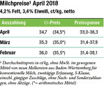 Der BWagrar-Milchpreis ist im April gegenüber März um 0,6 Cent weiter gefallen. Er liegt jetzt bei 34,7 Cent pro kg. Die Preisabstände zwischen den Molkereien haben sich im April verringert. Der BWagrar Bio-Milchpreis ging im April gegenüber März deutlich um 1,3 Cent pro kg zurück. Nach den schrittweisen Preisrückgängen seit Jahresbeginn scheint im April bei der konventionellen Milch die Talsohle erreicht, so die Einschätzung des Verbandes der Milcherzeuger Bayern e. V. (VMB). Seit April konnten sich einige Milchprodukte, vor allem die mit einem höheren Fettanteil, preislich wieder stabilisieren. Im Mai und Juni dürfte im Durchschnitt der Molkereien in Bayern die 34-Cent-Marke nicht unterschritten werden, so die Prognose beim VMB. „Die...