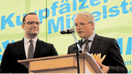 Mit Spargel im Spannkorb bedankte sich der Vorsitzende des Kreisbauernverbandes Rhein-Neckar, Wolfgang Guckert (r.), bei Bundesgesundheitsminister Jens Spahn für seine Rede beim Frühschoppen des Kurpfälzer Mittelstandes auf dem Mannheimer Maimarkt. Der Minister war zum ersten Mal Gast auf dem Maimarkt und zollte den Veranstaltern Respekt für die elftägige Messe. In seiner Rede im vollbesetzten Festzelt widmete sich der CDU-Politiker dem Erhalt der Wirtschaftskraft. Er tritt für einen Abbau von Regulierungen ein, gleichzeitig fordert er die Beteiligten zu mehr Engagement und Vorwärtsdenken auf.