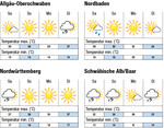 Am Samstag fallen gebietsweise noch gewittrige Schauer. Von Südwesten her löst sich die Bewölkung und die Temperaturen steigen bis 29 °C im Rheintal, 27 °C im Mittleren Neckarraum und 22 °C auf der Alb . Der Sonntag beginnt meist sonnig bei maximal 30 °C im Rheintal, 28 °C im Mittleren Neckarraum und 24 °C auf der Alb. Vereinzelt bilden sich in Hochlagen Gewitter. Am Montag hebt die Sonne bei zunehmendem Ostwind die Temperaturen bis 32 °C im Rheintal, 30 °C im Mittleren Neckarraum und 26 °C auf der Alb. Im Westen bilden sich gebietsweise Gewitter. Der Dienstag beginnt meist sonnig, bei maximal 29 °C im Rheintal und 23 °C auf der Alb bilden sich tags vor allem in Hochlagen teils heftige Gewitter. Die weiteren Tage bleiben sommerlich und...