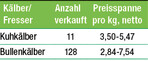 Auch im Juni bleibt die Nachfrage nach den nach wie vor nur in knapperem Umfang am Markt befindlichen Kälbern hoch. Insbesondere qualitativ hochwertige Kälber erzielen absolute Spitzenpreise. Die weiblichen Kälber zur Weitermast oder Aufzucht befinden sich weiterhin im preislichen Höhenflug und rechtfertigen somit unbedingt eine scharfe Selektion im Verkäuferbetrieb. Das geringe Angebot von nur elf aufgetriebenen Tieren in diesem Segment konnte die Nachfrage nicht decken, so dass sich ein Schnittpreis von 4,38 Euro pro kg ergab, welcher bei 82,3 kg mittlerem Marktgewicht 360 Euro pro Kopf entspricht. Ungebrochen ist auch die Nachfrage nach Bullenkälbern. Bei etwas umfangreicherem Angebot von 128 aufgetriebenen Kälbern, im Schnitt 81,6 kg...