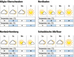 Der Samstag beginnt mit Nebel, insbesondere in den Hochlagen. Tagsüber löst sich der Nebel und es wird weitgehend sonnig, nachmittags bilden sich bei leichtem Wind aus Norden örtlich Quellwolken. Die Temperaturen erreichen 20°C im nördlichen Rheintal und im mittleren Neckarraum, 18°C am Bodensee und 14°C auf der Alb. Am Sonntag wird es weitgehend sonnig, in den Höhenlagen ist stellenweise mit dichter Bewölkung zu rechnen. Die Temperaturen steigen auf 21°C im nördlichen Rheintal, 19°C im mittleren Neckarraum und am Bodensee und 15°C auf der Alb. Am Montag wird es weitgehend sonnig bei leichten Quellwolken und Temperaturen um 22°C in den Ebenen und 16°C auf der Alb. Zum Dienstag steigen die Temperaturen auf bis zu 27°C in den Ebenen und es...