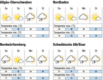 Am Samstag verdichtet sich die Bewölkung bei leicht böigem Wind aus östlichen Richtungen und es bilden sich an höheren Lagen Gewitter Die Temperaturen steigen auf 27 °C im nördlichen Rheintal, 24 °C im mittleren Neckarraum und am Bodensee, 21 °C auf der Alb. Im Verlauf des Tages lösen sich die Wolken zunehmend auf. Der Sonntag beginnt weitgehend sonnig. Gegen Nachmittag bilden sich örtlich Quellwolken. Die Temperaturen steigen auf 28 °C im nördlichen Rheintal, 27 °C im mittleren Neckarraum und 21 °C auf der Alb. Der Montag wird anfangs sonnig und etwas wärmer. Stellenweise bilden sich dichte Wolken, lokal gibt es Hitzegewitter. Am Dienstag verdichtet sich die Bewölkung von Westen her und sorgt gebietsweise für Schauer sowie leicht...