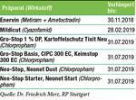 Das BVL hat die Zulassung mehrerer Pflanzenschutzmittel vorläufig und bis zum erneuten Ablauf verlängert. Neu zugelassen ist Beloukha (Wirkstoff: Pelargonsäure) zur Krautabtötung in Kartoffeln (Speise-, Wirtschafts- und Industriekartoffeln) mit 16 l/ha in 200 bis 400 l Wasser /ha nach vorherigem Krautschlagen. Es sind maximal 2 Anwendungen im Splittingverfahren im Abstand von 5 bis 7 Tagen möglich. Wartezeit: F.