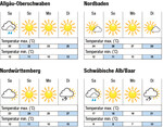 Der Samstag beginnt meist dicht bewölkt. Im Osten fallen noch vereinzelt Schauer. Im Laufe des Tages lockert sich die Bewölkung allerdings von Westen her auf, bei Temperaturen bis 25°C im Rheintal, 23°C im Neckarraum und 17°C auf der Alb. Der Sonntag wird nach der Auflösung der Frühnebelfelder meist sonnig, bei auffrischendem Ostwind und maximal 26°C im Rheintal, 24°C im Neckarraum und 18°C auf der Alb. Am Montag scheint meist die Sonne bei zeitweise starkem Ostwind. Die Temperaturen betragen bis 27°C in den Ebenen und 19°C auf der Alb. Der Dienstag wird meist sonnig. Tagsüber bilden sich Quellwolken, bei nachlassendem Ostwind und maximal 29°C in den Ebenen und 21°C auf der Alb. Die Folgetage werden meist sonnig. | →Das...
