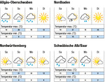 Nach teils starken Niederschlägen in der Nacht beginnt der Samstag meist dicht bewölkt und mit lokal ausklingenden Niederschlägen. Im Verlaufe des Tages lockert sich die Bewölkung von Norden her, bei maximal 19 °C im Rheintal und im Neckarraum, und 13 °C auf der Alb. Der Sonntag wird meist wechselhaft, mit wiederholten Schauern bei teils stürmischem Wind aus Westen und Temperaturen bis 21 °C im Rheintal und im Neckarraum, und 16 °C auf der Alb. Der Montag bleibt meist mässig bis dicht bewölkt, bei Temperaturen bis 16 °C in den Ebenen und 8 °C auf der Alb. Der Dienstag wird nach Auflösung früher Nebelfelder meist sonnig, bei maximal 16 °C in den Ebenen und 9 °C auf der Alb. Die Folgetage werden voraussichtlich sonnig mit frischen...