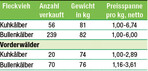 Bei der RBW-Kälberauktion am 6. September in Donaueschingen wurden von 386 Kälbern bis auf eines alle verkauft. Die Preise der Fleckvieh-Kuhkälber und der Vorderwälder-Bullenkälber verbesserten sich, die übrigen Gattungen hielten das Vormonatsniveau. Die 20 Vorderwälder-Kuhkälber kamen im Durchschnitt auf 115 Euro je Kalb, die 56 gefragten Fleckvieh-Kuhkälber auf 267 Euro je Kalb, die 70 Vorderwälder-Bullenkälber erlösten 228 Euro je Kalb und die 239 Fleckvieh-Bullenkälber kamen im Durchschnitt auf 402 Euro je Kalb.