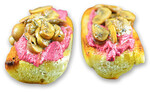 1 Baguette-Brot Für das Pesto: 200 g Rote Bete (vorgekocht)), 100 g geschälte Walnüsse, 80 ml Olivenöl, 1 TL Honig, 1 EL Zitronensaft, Salz, Pfeffer Für den Pilz-Belag: 250 g braune Champignons oder andere Pilze, 1 Knoblauchzehe, Salz, Pfeffer, etwas Olivenöl, 1 TL einer Gewürzmischung für Pilz-Gerichte (z. B. Herbaria Waldes-Lust).