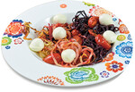 850 g Rote Bete 10 Kirschtomaten 1 Knoblauchzehe 20 kleine Mozzarella-Kugeln Olivenöl, Salz und Pfeffer italienische Gewürzmischung