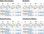 Am Samstag lockert sich die Bewölkung im Tagesverlauf auf. Die Temperaturen steigen bis zu 9°C im Rheintal und im Neckarraum und bis 4°C auf der Alb. Am Sonntag bringt böigfrischer Südwestwind dichte Bewölkung und mehrmals täglich teils starken Regen, bei maximal 12°C im Rheintal und im Neckarraum, und 7°C auf der Alb. Am Montag erreicht der Westwind in Hochlagen Sturmstärke, und bringt teils gewittrige Regenschauer bei maximal 14°C in den Ebenen und 9°C auf der Alb. Am Dienstag wechseln sich Schauer, Bewölkung und einzelne Aufhellungen ab, bei böig-frischem Westwind und maximal 12°C in den Ebenen und 7°C auf der Alb. Die Folgetage bleiben voraussichtlich wechselhaft und windig, bei fallenden Temperaturen. | →Das detaillierte...