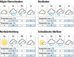 Der Samstag beginnt mit Hochnebel und Nachtfrost bis in die Ebenen, in Hochlagen klar bei bis zu - 10 °C. Im Tagesverlauf erscheint auch in den Ebenen die Sonne, bei maximal 2 °C im Rheintal, 1 °C im Neckarraum und - 4 °C auf der Alb. Am Sonntag bringt rasch zunehmender Südwestwind Wolken mit Schneefall, teils Eisregen, der zunehmend in Regen übergeht. Die Temperaturen steigen auf maximal 1 °C im Rheintal, 2 °C im Neckarraum und - 1 °C auf der Alb. Am Montag fallen weitere Regenschauer bis in Hochlagen, bei teils böigem Westwind und maximal 7 °C in den Ebenen und 2 °C auf der Alb. Am Dienstag nehmen Wind und Bewölkung ab, bei maximal 7 °C in den Ebenen und 2 °C auf der Alb. Die Folgetage bleiben meist bewölkt mit weiteren Niederschlägen...