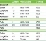 Bei Winterwetter fand am 8. Januar die erste Großviehauktion in Bad Waldsee statt. Braunvieh : Der jüngste aufgetriebene Braunvieh-Deckbulle wurde Körsieger, ein Vax- Sohn aus der Zucht der Familie Held aus Donaustetten. Bei den Jungkühen überzeugte eine Virand-Tochter von Martin Hänsler aus Wangen mit 33,7 kg Milch für 2050 Euro. Ergänzt wurde das Angebot mit 17 Tieren aus einem Aufgabebetrieb. Die angebotenen Braunviehzuchtkälber wurden flott verkauft. Fleckvieh : Ein Wertvoll-Sohn aus einer Inder-Tochter stand an der Spitze der Fleckviehbullen. Das von Joachim Keller gezüchtete Tier erlöste 2000 Euro. Die Kollektion der Fleckviehjungkühe enthielt einige Spitzentiere. Eine Polarsee-Tochter von Siegbert Blum aus Walbertsweiler verkaufte...