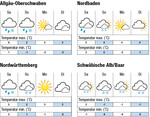 In der Nacht zum Samstag gibt es Frost in den höheren Lagen. In den Ebenen fallen Regenschauer und in Hochlagen fällt Schnee. Am Tag gibt es dann von Süden her Aufhellungen. Die Temperaturen liegen bei maximal 5°C im Rheintal und im Neckarraum und 2°C auf der Alb. Am Sonntag gibt es teils Nachtfrost sowie Schneefälle bis in tiefere Lagen. Der Wind dreht auf Nordwesten und frischt auf, bei Temperaturen von maximal 4°C im Rheintal, 2°C im Neckarraum und -2°C auf der Alb. Der Montag wird meist sonnig bis leicht bewölkt, bei maximal 4°C in den Ebenen und -2°C auf der Alb. Am Dienstag bringt dichtere Bewölkung gebietsweise Schauer, bei maximal 4°C in den Ebenen und -2°C auf der Alb. Die folgenden Tage werden wieder freundlicher bei ähnlichen...