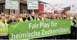 Gelb, grün und orange leuchten die Westen von nahezu 400 Zuckerrübenanbauern, als sie vor der Tiefenbachhalle in Ilsfeld-Auenstein für „faire Wettbewerbsverhältnisse", vor allem im Vergleich zu vielen EU-Ländern, demonstrieren. Sie fühlen sich nach drastischen Erlöseinbußen von der Politik alleingelassen. Unter den Demonstranten: Joachim Rukwied (M., grüne Weste), Vorsitzender des Verbands baden-württembergischer Zuckerrübenanbauer, und des DBV, und Dr. Rainer Schechter, Südzucker (l. daneben).