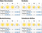 Zum Samstag gibt es verbreitet leichten Nachtfrost. Während des Tages scheint – nach rascher Auflösung von Nebelfeldern – durchgehend die Sonne. Die Temperaturen liegen bei maximal 11°C im Rheintal, bei 13°C im Neckarraum und betragen etwa 9°C auf der Alb. Am Sonntag ändert sich die Wetterlage kaum. Der Montag beginnt meist sonnig. Im Laufe des Tages bringt frischer Südwestwind zunehmende Bewölkung mit sich. Die Temperaturen betragen maximal 14°C in den Ebenen und 10°C auf der Alb. Am Dienstag wechselt die Bewölkung. Es gibt vor allem in Hochlagen einzelne Schauer, die teils als Schnee niederschlagen. Die Temperaturen liegen bei maximal 11°C in den Ebenen und 6°C auf der Alb. Der Mittwoch wird voraussichtlich wechselhafter, danach...