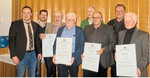 Auf der Hauptversammlung des Verbandes der Landwirtschaftsmeister Reutlingen in Dapfen übergaben Vorstand Hagen Hohl (l.), Ausschussmitglied Daniel Eisele (2. v. l.) und Kassierer Markus Kern (2. v. r.) den Goldenen Meisterbrief an (v. l.) Albrecht Heideker, Hans Jörg Munz, Wolfgang Wörner und Hans Heideker. Den Silbernen Meisterbrief erhielt Paul Erzberger (4. v. r.). Weitere Goldene Meisterbriefe gingen in Abwesenheit an Walter Hölz und Georg Vetter.