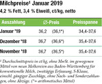 Der BWagrar-Milchpreis ist im Januar gegenüber Dezember um einen halben Cent zurückgegangen, von 36,7 Cent pro kg auf 36,2 Cent pro kg. Damit blieb das Preisniveau immer noch vergleichsweise stabil. Der BWagrar-Biomilchpreis ging im Januar um 0,6 Cent zurück. Während der Butterpreis gefallen ist, konnten die Preise für Pulver zulegen. So besteht jetzt die Chance, dass der Eiweißmarkt 2019 wieder besser laufen wird als im vergangenen Jahr. Der Kieler-Rohstoffwert, in den die Erlöse für Butter und für Magermilchpulver einfließen, ist im Januar gegenüber Dezember um 1,5 Cent auf 32,2 Cent pro kg gestiegen. Laut Marktbericht der Süddeutschen Butter- und Käsebörse vom 13. Februar läuft der Absatz von Butter und auch von Emmentaler und...