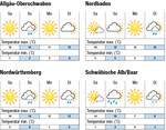 Am Samstag scheint nach rascher Auflösung früher Nebelfelder die Sonne. Tagsüber bilden sich Quellwolken, bei Temperaturen von maximal 19°C im Rheintal und im Neckarraum und 14°C auf der Alb. Am Sonntag ziehen Wolken auf. Im Osten fallen Regenschauer bei Temperaturen von maximal 13°C im Rheintal, 14°C im Neckarraum und 10°C auf der Alb. Am Montag löst frischer Ostwind die Wolken wieder auf. Das Thermometer steigt auf 14°C in den Ebenen und auf bis zu 7°C auf der Alb. Am Dienstag bringt auffrischender Westwind zunehmende Bewölkung bei maximal 13°C in den Ebenen und 9°C auf der Alb. Am Abend fallen dann Schauer, in den Hochlagen sogar als Schnee. Die Folgetage werden voraussichtlich feucht und deutlich kühler. | →Das detaillierte...