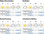 Der Samstag beginnt mit Nachtfrost. Frischer Ostwind löst die Nebelfelder dann auf und die Sonne hebt die Temperaturen bis 18°C im Rheintal, 17°C im Neckarraum und 12°C auf der Alb. Der Sonntag beginnt meist frostfrei und sonnig. Der Ostwind lässt bald nach und die Temperaturen klettern auf maximal 17°C im Rheintal, 16°C im Neckarraum und 11°C auf der Alb. Gegen Abend ziehen von Westen her, vor allem in Hochlagen, Schauer auf. Der Montag wird meist dicht bewölkt mit einzelnen Regenschauern. Die Temperaturen liegen bei bis zu 15°C in den Ebenen und 9°C auf der Alb. Der Dienstag wird wechselhaft. Die Temperaturen liegen dann bei maximal 15°C in den Ebenen und 9°C auf der Alb. Die Folgetage bleiben voraussichtlich feucht mit ähnlichen...