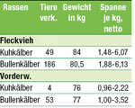 Am 3. April waren bei der RBW-Kälberauktion in Donaueschingen 302 Fleckvieh- und Vorderwälder-Kälber zum Verkauf angeboten worden. Die Preise konnten über alle Gattungen hinweg anziehen. Die fünf Vorderwälder-Kuhkälber trafen auf eine verhaltene Nachfrage. Die 49 Fleckvieh-Kuhkälber zogen im Preis an und waren mit durchschnittlich 84 kg sehr schwer. Sie erzielten 2,99 Euro pro kg und 251 Euro pro Kalb. Zuchtkälber mit Abstammungen legten im Preis deutlich zu. Für die 53 Vorderwälder-Bullenkälber mit durchschnittlich 77 kg Gewicht wurden im Schnitt netto 267 Euro angelegt. Die 185 Fleckvieh-Bullenkälber legten einen Preissprung hin und kamen auf 427 Euro je Kalb bei einem Gewicht von 80,5 kg. Dies ergibt im Durchschnitt einen Preis von...