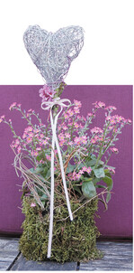 Auch mit einem Herz aus Draht kann eine Botschaft überbracht werden. Die Vorgehensweise ist bis zur Kugel exakt die gleiche wie beim dem Körbchen. Die schön geformte Kugel drücken wir etwas platt. An einer Stelle drücken wir mit der Schere oder einem Löffel nach innen. So entsteht die obere Seite des Herzes. Jetzt muss noch die Spitze geformt werden. Mit den Fingern drückt man den Draht zusammen und zieht die Spitze etwas nach unten. Durch das Biegen lässt sich die Form immer korrigieren. Das fertige Herzchen könnte so mit einem hübschen Band aufgehängt werden. Oder man befestigt durch mehrmaliges Umwickeln noch einen Steckdraht an der Spitze und verwendet das Drahtherz als Blumenstecker. Mit ein paar Blütchen und etwas Band bekommt das...