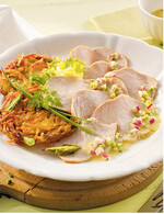 600 g Putenbrust Salz und Pfeffer aus der Mühle 5-6 EL Sonnenblumenöl 2 rote Zwiebeln 1 Bund Schnittlauch 2 EL Weißweinessig 1 TL Dijon-Senf 75 ml Geflügelbrühe 200 g weißen Spargel 200 g grünen Spargel 400 g vorwiegend festkochende Kartoffeln 2-3 EL Speisestärke 80 g Butterschmalz etwas Friséesalat