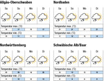 Die kommenden Tage sind meist bewölkt mit zahlreichen Niederschlägen und häufig Gewitter. Der Samstag wird meist dicht bewölkt. Im Tagesverlauf setzen Gewitter ein. Die Temperaturen liegen bei maximal 21°C im Rheintal, 20°C im Neckarraum und 14°C auf der Alb. Am Sonntag bleibt es durchgehend dicht bewölkt mit zahlreichen Gewitterschauern. Die Temperaturen steigen auf maximal 21°C im Rheintal, 19°C im Neckarraum und 13°C auf der Alb. Am Montag und Dienstag bleibt es weiter dicht bewölkt mit zahlreichen gewittrigen Schauern. Die Temperaturen steigen auf maximal 20 bis 21°C in den Ebenen und 12 bis 14 °C auf der Alb. Die Folgetage bleiben meist bewölkt mit weiteren Schauern und ähnlichen Temperaturen. | →Das detaillierte Agrarwetter...