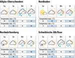 Am Samstag bringt mäßiger Nordwind zunehmende Bewölkung und vor allem in Hochlagen Gewitterschauer. Die Temperaturen liegen bei bis zu 22°C im Rheintal, 21°C im Neckarraum und 16°C auf der Alb. Der Sonntag wird meist wechselnd bewölkt mit vereinzelten Schauern. Das Thermometer steigt auf bis zu 23°C im Rheintal, 21°C im Neckarraum und 16°C auf der Alb. Am Montag zieht mit auffrischendem Westwind rasch dichte Bewölkung auf und es gibt einige teils gewittrige Schauer. Die Temperaturen betragen bis zu 20°C in den Ebenen und 15°C auf der Alb. Der Dienstag bleibt voraussichtlich dicht bewölkt mit teils anhaltendem Regen, bei bis zu 18°C in den Ebenen und 11°C auf der Alb. Die Folgetage bleiben voraussichtlich wechselhaft bei langsam...