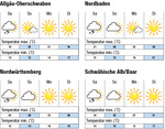 Am Samstag ziehen zahlreiche, teils heftige Gewitter auf, bei bis zu 21 °C im Rheintal, 20 °C im Neckarraum und 15 °C auf der Alb. Am Sonntag löst sich die Bewölkung rasch, bei bis zu 26 °C in den Ebenen und 22 °C auf der Alb. Am Montag scheint meist die Sonne bei leicht böigem Ostwind, bei bis zu 33 °C in den Ebenen und 27 °C auf der Alb. Der Dienstag wird sehr sonnig, bei bis zu 36 °C in den Ebenen und 31 °C auf der Alb. Die Folgetage werden voraussichtlich meist sonnig bei leicht zurückgehenden Temperaturen. | →Das detaillierte Agrarwetter für Ihre Region finden Sie unter www.bwagrar.de. →Wetter nach Hause gibt es auch im Wetterfax unter www.lbv-smg.de.