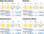 Der Samstag wird bei mäßig-frischem Ostwind sehr sonnig, bei bis zu 31 °C im Rheintal, 30 °C im Neckarraum und 26 °C auf der Alb. Der Sonntag wird ebenfalls meist sonnig. Die Temperaturen erreichen bis zu 35 °C im Rheintal, 34 °C im Neckarraum und 29 °C auf der Alb. Am Montag zieht mit böigem Westwind rasch Bewölkung auf. Im Verlauf des Tages gibt es lokal teils heftige Gewitter bei bis zu 29 °C in den Ebenen und 24 °C auf der Alb. Der Dienstag wird im Süden meist bewölkt mit weiteren Niederschlägen, im Norden teils freundlicher bei bis zu 24 °C in den Ebenen und 18 °C auf der Alb. Die Folgetage werden voraussichtlich wieder freundlicher bei leicht ansteigenden Temperaturen. | →Mehr Agrarwetter unter www.bwagrar.de. →Wetter...