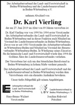 Der langjährige Güterdirektor der Südzucker AG, Dr. Karl Vierling, ist im Alter von 89 Jahren verstorben. Nach landwirtschaftlichem Studium in Hohenheim war der aus dem Kraichgau stammende Dr. Vierling ab 1959 Verwalter auf dem Tennhof bei Stuttgart. 1961 kam er zur Güterdirektion der Südzucker in Heilbronn, deren Leitung er von 1966 bis zum Eintritt in den Ruhestand 1993 innehatte. Ab 1983 war er Vorsitzender des Arbeitgeberverbandes der Land- und Forstwirtschaft in Württemberg-Baden und stand nach der Fusion mit dem Arbeitgeberverband für Württemberg-Hohenzollern im Jahr 1990 bis 1994 dem neu gegründeten Arbeitgeberverband der Land- und Forstwirtschaft vor. Als Vorsitzender der Arbeitgeberverbände war er Vorstandsmitglied zunächst des...