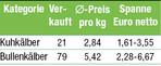 Mit 21 Kuhkälbern war die Auktion am 3. Juli ordentlich beschickt. Die Gebote kamen zügig, so dass alle Kälber um durchschnittlich 2,84 Euro pro Kilogramm (kg) zugeschlagen werden konnten. Kälber im mittleren Gewichtsbereich konnten Preise bis 3,55 Euro realisieren. Pro Kopf wurden bei knapp 80 kg Durchschnittsgewicht 227 Euro angelegt. Hochwertige Bullenkälber mit sauberem BTV8-Status waren sehr gefragt, so dass der Preis für diese Kälber deutlich anziehen konnte. Insbesondere junge, gut entwickelte Tiere waren hier sehr gefragt. Kälber ohne gültigen Status oder solche mit deutlichen Mängeln waren und sind nur mit massivsten Preisabschlägen – knapp unter dem Niveau des Kuhkälberpreises – zu vermarkten. Erfreulicherweise waren jedoch die...
