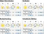 Der Samstag wird meist sonnig. Vereinzelt zieht leichte Bewölkung durch und die Temperaturen liegen bei maximal 24°C im Rheintal, 23°C im Neckarraum und 20°C auf der Alb. Am Sonntag zieht zunehmende Bewölkung auf und es gibt lokale Schauer. Das Thermometer zeigt bis zu 23°C in den Ebenen und 19°C auf der Alb. Der Montag bleibt nach nächtlichen, teils starken Niederschlägen wechselhaft mit auffrischendem Westwind. Die Temperaturen betragen bis zu 21°C in den Ebenen und 16°C auf der Alb. Der Dienstag wird meist mässig bewölkt mit lokalen Schauern. Die Temperaturen lieben bei maximal 21°C in den Ebenen und 16°C auf der Alb. In den Folgetagen sind lokal weitere Schauer möglich, bei ähnlichen Temperaturen. | →Das detaillierte...