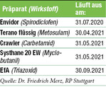 Die EU-Kommission hat darüber informiert, dass die Genehmigungen der Wirkstoffe Spirodiclofen, Metosulam, Carbetamid, Myclobutanil und Triazoxid auslaufen werden. Grund ist, dass die Antragssteller keine Verlängerung beantragt haben. Das Bundesamt für Verbraucherschutz und Lebensmittelsicherheit wird zu gegebener Zeit über das Zulassungsende von Pflanzenschutzmitteln mit diesen Wirkstoffen in Deutschland informieren.