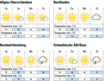 Am Samstag scheint ganztägig die Sonne, bei maximal 22 °C im Rheintal, 23 °C im Neckarraum und18 °C auf der Schwäbischen Alb. Der Sonntag wird meist sonnig mit vereinzelt leichter Bewölkung, die Temperaturen steigen auf maximal 24 °C im Rheintal, 25 °C im Neckarraum und 19 °C auf der Alb. Am Montag und Dienstag bleibt es weiterhin sonnig. Am Dienstag wird es dann etwas kühler und im Tagesverlauf setzt Regen ein, der lokal sogar mit Gewitter einhergehen kann. Die Temperaturen erreichen maximal 18 bis 25 °C in den Ebenen und 12 bis 19 °C auf der Alb. Die Folgetage der Kalenderwoche 42 bleiben meist bewölkt mit weiteren Schauern und kühleren Temperaturen. | →Das detaillierte Agrarwetter für Ihre Region finden Sie im Internet auf...