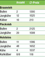 Auf der RBW-Auktion am 9. Oktober war das Angebot an Jungkühen über alle Rassen knapp. Braunvieh: Dem großen Angebot an Zuchtbullen stand nur eine verhaltene Nachfrage entgegen. Körsieger wurde ein Hickory-Sohn von Familie Rehm, Ochsenhausen. Reservesieger war ein Bisto-Sohn, vorgestellt von Peter Rohmer, Kirchdorf. Flott kamen die Gebote bei den Jungkühen. Für eine Vassli-Tochter erlöste der Betrieb Rehm, Ochsenhausen, 1800 Euro. Den gleichen Preis erzielte Edwin Kling, Murrwangen, ebenfalls für eine Vassli-Tochter. Fleckvieh: Körsieger wurde aus der Zucht von Alfred Berger, Mieterkingen, ein Imperativ-Sohn, der für 2400 Euro verkauft wurde. Aus dem gleichen Betrieb stammte der Reservesieger, ein Hosianna-Sohn. An der Spitze der Jungkühe...