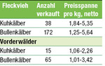 Am 2. Oktober fand die RBW-Kälberauktion in Donaueschingen statt. Es standen 305 Kälber zum Verkauf, die Preise waren über alle Kategorien stabil. Die Vorderwälder-Kälber waren von guter Qualität. Bei den Fleckvieh-Kuhkälbern waren hervorragende Abstammungen dabei. Ein genetisch hornloses PP Kuhkalb war einem Züchter über 500 Euro wert. Gezüchtet und vorgestellt wurde das Kalb von Hubert Ewald, Bräunlingen. Die 17 Vorderwälder-Kuhkälber waren 76 kg schwer. Die 51 Fleckvieh-Kuhkälber (80 kg) und erzielten 2,93 Euro pro kg und 234 Euro pro Kalb. Für die 65 Vorderwälder-Bullenkälber (77 kg) wurden im Schnitt netto 247 Euro angelegt. Die 173 Fleckvieh-Bullenkälber kamen auf 410 Euro je Kalb.