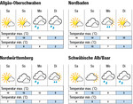 Der Samstag wird meist sonnig, mit vereinzelter Bewölkung, bei maximal 18 °C im Rheintal, 19 °C im Neckarraum und 16 °C auf der Alb. Am Sonntag zieht Bewölkung auf und die Sonne zeigt sich nur vereinzelt. Die Temperaturen steigen auf maximal 14 °C im Rheintal, 15 °C im Neckarraum und 15 °C auf der Alb. Am Montag und Dienstag bleibt es dicht bewölkt mit zahlreichen Schauern. Im Hochschwarzwald fällt am Dienstag Schnee. Die Temperaturen liegen bei maximal 9 bis 12 °C in den Ebenen und 5 bis 10 °C auf der Alb. Die Folgetage bleiben meist wechselhaft mit weiteren Schauern und ähnlichen Temperaturen. | →Mehr Agrarwetter unter www.bwagrar.de. →Wetter nach Hause gibt es auch im Wetterfax unter www.lbv-smg.de.
