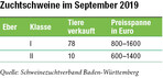 Der Schweinemarkt zeigte im September weiterhin eine ausgeglichene Tendenz mit guten Preisen. Durch eine, auch wetterbedingt, bessere Nachfrage im Exportgeschäft, der Besamung und der Ferkelerzeugung sowie ein hochwertiges Angebot der Zuchtbetriebe konnten die Verkaufszahlen der Eber nach einem Tief im August wieder gesteigert werden. Insgesamt wurden von den in Baden-Württemberg ansässigen Züchtern knapp 90 Jungeber zu Durchschnittpreis von 1170 Euro verkauft. Annähernd die Hälfte davon ging in den Export an verschiedene spanische Kunden. In Klasse I konnten 78 Tiere bewertet und verkauft werden. Diese waren durchweg genomisch typisiert und mit entsprechend gesicherten Zuchtwerten versehen. Im September wurden nur wenige Eber der...