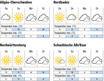 Der Samstag wird bei böig-frischem Ostwind meist sonnig bis leicht bewölkt. Die Temperaturen liegen bei bis zu 11°C im Rheintal und im Neckarraum und 9°C auf der Alb. Der Sonntag wird dann meist sonnig. Zeitweise zieht leichte Bewölkung durch. Das Thermometer klettert auf bis zu 9°C im Rheintal, 11°C im Neckarraum und 11°C auf der Alb. Am Montag wird es meist dicht bewölkt. Die Temperaturen betragen bis zu 10°C in den Ebenen und 7°C auf der Alb. Der Dienstag bleibt voraussichtlich meist bewölkt mit lokalen Regenschauern. Hier erreichen die Temperaturen maximal 12°C in den Ebenen und 7°C auf der Alb. Die Folgetage werden voraussichtlich feucht bei leicht zurückgehenden Temperaturen. | →Das detaillierte Agrarwetter für Ihre Region...
