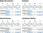 Der Samstag wird, bei mässig-frischem Westwind, meist bewölkt, lokal sind leichte Schauer möglich. Die Temperaturen liegen bei bis zu 8°C im Rheintal, 9°C im Neckarraum und 5°C auf der Alb. Am Sonntag gibt es bei anhaltender Bewölkung einige Niederschläge und in Hochlagen teils Schneeregen. Die Temperaturen steigen auf bis zu 9°C im Rheintal, 10°C im Neckarraum und 5°C auf der Alb. Am Montag bleibt die Bewölkung dicht und es gibt anhaltende Niederschläge mit Schnee in den Hochlagen. Die Temperatur beträgt bis zu 8°C in den Ebenen und 2°C auf der Alb. Der Dienstag wird voraussichtlich leicht bis mässig bewölkt mit lokalen Schauern. Das Thermometer steigt auf maximal 6°C in den Ebenen und 1°C auf der Alb. Die Folgetage bleiben...