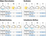 Die Nächte bringen meist leichten Frost, das Wochenende wird feucht, ab Montag ist es dann freundlicher. Der Samstag wird nach verbreitetem Nachtfrost bewölkt mit einigen Niederschlägen. Bis in die mittleren Lagen kann es Schneeregen geben. Die Temperaturen betragen bis zu 5°C im Rheintal, 4°C im Neckarraum und 3°C auf der Alb. Der Sonntag bleibt bewölkt mit verbreitetem Schneefall oder Schneeregen. Das Thermometer klettert auf bis zu 4°C im Rheintal und im Neckarraum und 2°C auf der Alb. Am Montag lockert sich die Bewölkung. Die Temperaturen betragen bis zu 5°C in den Ebenen und 3°C auf der Alb. Am Dienstag nimmt die Bewölkung voraussichtlich zu. Die Temperaturen liegen bei maximal 6°C in den Ebenen und 3°C auf der Alb. Die Folgetage...