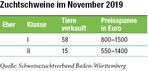 Das Hoch auf dem Schlachtschweinemarkt und der gute Ferkelpreis im November beflügelten den Ebermarkt nur wenig. Der Verkauf von Zuchtebern lief weiterhin eher zurückhaltend. Auch der Bedarf aus der Besamung war eher mäßig. Es wurden insgesamt 72 Tiere mit bestem Exterieur und entsprechenden genomischen Zuchtwerten verkauft. Davon waren 58 in der Klasse I bewertet. Der Durchschnittspreis lag bei etwas über 1200 Euro. 25 Jungeber gingen nach Spanien. Eber der Deutschen Landrasse wurden im November wiederum nur wenige gehandelt. Die Spitzentiere mit der Abstammung Kick und Origine kamen von Tobias Peter in Aach-Linz, zeigten gute Länge, die gewünschte Bemuskelung und ein stabiles Fundament. Von Klaus und Philipp Benz in Bingen kam ein gut...