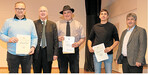 Im Rahmen der gemeinsamen Jahreshauptversammlung der Bauernverbände Rottweil und Tuttlingen am Samstag vergangener Woche in der Graf-Gerold-Halle in Dietingen standen auch Ehrungen auf der Tagesordnung: Für ihr Engagement im Rahmen der Gläsernen Produktion wurden Jörg Schittenhelm aus Dietingen (l.) und Samuel Sauter aus Epfendorf (2. v. r.) sowie Kreisvorsitzender Manfred Haas (Mitte) für seine 25-jährige Tätigkeit als Berichterstatter für das statistische Landesamt durch Landrat Dr. Wolf-Rüdiger Michel (2. v. l) und Landwirtschaftsamtsleiter Hans Klaiber (r.) mit einer Urkunde ausgezeichnet. →Mehr zum Bauerntag auf Seite 12 sowie unter www.bwagrar.de , Webcode 6505471