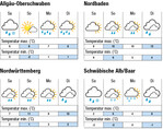 Der Samstag wird nach leichtem Nachtfrost und Schneefällen bis in mittlere Lagen meist bewölkt sein. Lokal können sich Schauer bilden. Die Temperaturen klettern auf bis zu 9°C im Rheintal, 7°C im Neckarraum und 3°C auf der Alb. Der Sonntag wird nach verbreitet leichtem Nachtfrost sonnig bis leicht bewölkt. Die Temperaturen betragen bis zu 10°C im Rheintal, 11°C im Neckarraum und 5°C auf der Alb. Der Montag wird zunehmend bewölkt mit lokalen Regenschauern und Schnee in den Hochlagen. Das Thermometer zeigt bis zu 10°C in den Ebenen und 4°C auf der Alb. Der Dienstag wird voraussichtlich dicht bewölkt mit anhaltenden Niederschlägen, bei bis zu 10°C in den Ebenen und 4°C auf der Alb. Die Folgetage werden voraussichtlich freundlicher mit leicht...