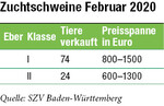 Der Schweinemarkt zeigte sich im Februar weiterhin freundlich mit weiter steigenden Ferkelpreisen. Diese positiven Impulse konnten die Eber-Zuchtbetriebe in Baden-Württemberg ein wenig mitnehmen. Der anziehende Export nach Spanien und Belgien sowie der Verkauf an die Ferkelerzeugung brachten etwas Bewegung in die ruhige Nachfrage vom Januar. Die Besamungsstationen hielten sich beim Einkauf aber weiter zurück. Der Verkauf übertraf mit knapp 100 Tieren die Zahlen des Vorjahres. Über die Hälfte der Tiere verließ Baden-Württemberg. Der Durchschnittspreis betrug 1150 Euro. Bei hoher Qualität, dahinterstehend die geforderte genomische Typisierung, konnten 74 der verkauften Jungeber in Klasse I eingestuft werden. Eber der Deutschen Landrasse...