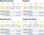 Das Wetter präsentiert sich bis Ostern meist leicht bis mässig bewölkt. Die Temperaturen liegen bei jeweils bis zu 24°C. Ab Sonntag sind lokale Gewitterschauer möglich. Der Samstag wird sonnig bis leicht bewölkt. Das Thermometer zeigt bis zu 24°C im Rheintal und im Neckarraum und 18°C auf der Alb. Der Sonntag wird leicht bis mässig bewölkt. Zwischenzeitlich muss mit lokalen Gewitterschauern gerechnet werden. Die Temperaturen liegen bei bis zu 24°C im Rheintal, 23°C im Neckarraum und 17°C auf der Alb. Der Ostermontag zeigt sich mässig bis dicht bewölkt mit lokalen Schauern. Die Temperturen bleiben bei bis zu 22°C in den Ebenen und 17°C auf der Alb. Der Dienstag wird leicht bis mässig bewölkt. Das Thermometer klettert auf bis zu 20°C in den...