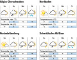 Der Samstag wird meist sonnig bis leicht bewölkt, vereinzelt sind dichtere Wolken und Gewitterschauer möglich. Die Temperaturen betragen bis zu 21°C im Rheintal, 22°C im Neckarraum und 16°C auf der Alb. Der Sonntag wird wechselhaft mit verbreiteten Gewitterschauern. Das Thermometer zeigt bis zu 23°C im Rheintal, 22°C im Neckarraum und 15°C auf der Alb. Der Montag wird, bei teils frischem Westwind, meist mäßig bewölkt mit einigen Gewitterschauern. Die Temperaturen betragen bis zu 22°C in den Ebenen und 15°C auf der Alb. Der Dienstag bleibt voraussichtlich bewölkt mit einigen Niederschlägen. Der Wind aus westlichen Richtungen frischt rasch auf. Die Temperaturen liegen bei bis zu 16°C in den Ebenen und 11°C auf der Alb. Die Folgetage bleiben...