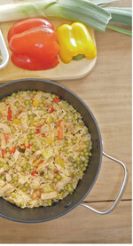 250 g Reis oder Couscous oder Bulgur, nach Anleitung in Brühe gegart, 4 Schnitzel vom Schwein oder Pute oder Hähnchen, 1 rote Paprika, 1 gelbe Paprika, 1 Bund Lauchzwiebeln oder 1 Lauchstange, 2 Zwiebeln, 300 g Erbsen (TK), Butterschmalz, Salz, Pfeffer